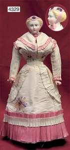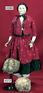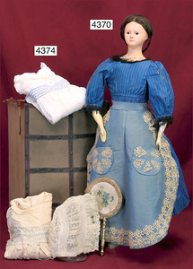 Modepuppe, Frankreich, ungemarkt, 56 cm, Biskuit-Kurbelkopf, blaue Paperweightaugen, geschl. Mund, durchst. Ohren, Biskuit-Brustblatt, Lederkörper, Körper mit alten Flickstellen, Biskuit-Arme, 1 Hand ausgebessert, Kleidung aus alten Stoffen genäht, Perücke neuer, schöne Gr.