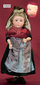 Biskuit-Porzellan-Brustblattkopf-Puppe, 24,5 cm, blonde modellierte Haare, blaue gemalte Augen, geschl. Mund, Stoffkörper, Biskuit-Unterarme, Orig.-Kleidung, als Schotte