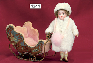 Puppen-Botanisiertrommel, 8,5 cm, Blech lithogr., Motiv Kind mit Schlitten, schöne Gr.