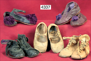 Konv. 5 Paar Puppenschuhe, 1910 - 1920, Gr. 6 - 8, teils Leder, teils Wachstuch