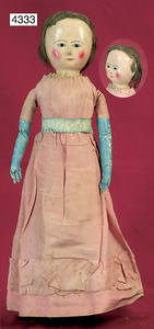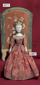 Holzpuppe, ca. 1880, 42 cm, fest eingesetzte braune Glasaugen, geschl. Mund, Körper Holz, Leder und Wachstuch
