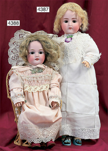 K&R Simon & Halbig, 403, Laufpuppe, mit Kopfdrehmechanik u. Stimme, 45 cm, blaue Schlafaugen, off. Mund, oben Zähne, Gliederkörper, feste Beine, schöne Mohairperücke, Kleidung aus alten Stoffen genäht
