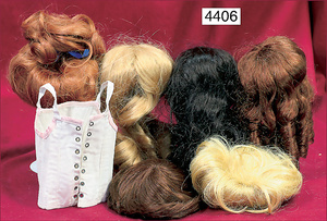 Konv. Ca. 50 Puppen-Perücken, meist neuer, ein paar alt, dazu 1 Mieder