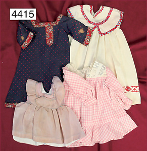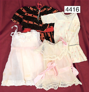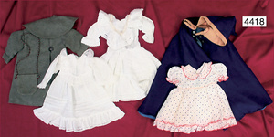 Konv. 4 Teile Puppenkleidung für ca. 38-40 cm Puppen, Baumwollkleid, Kleid mit Spitze, 2 Teile Unterkleidung, ca. 1910