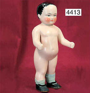 Badepuppe, Frozen Charlie, 36 cm, glasiertes Porzellan, dunkle gemalte Haare, leicht rosa getönter Körper