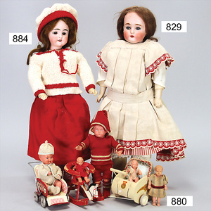 Konv. Porzellan- u. Celluloid-Püppchen, darunter einige Puppenstuben-Puppen, Köpfe gemarkt AM 16, bewegl. Arme u. Beine, anmodellierte Schuhe u. Strümpfe, eingesetzte Glasaugen, 1 x K&R 126, Riss über die Stirn, fest eingesetzte Glasaugen, off. Mund, Zähne, Masse-Stehkörper, 20 cm, Porzellan-Puppe mit aufmodellierter Haube, Stoffkörper, Porzellan-Arme u. -Unterschenkel, Hersteller?, 16 cm, 1 x Minerva Celluloid-Baby, gemarkt 15, u. anderes