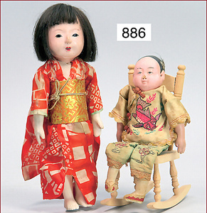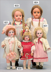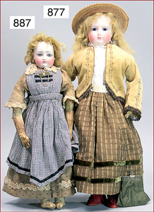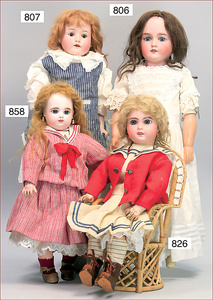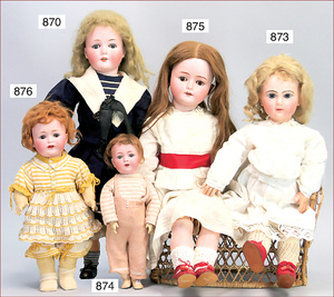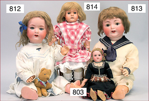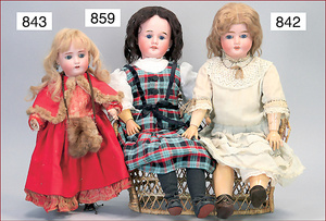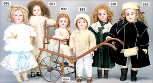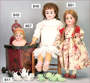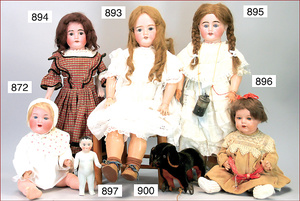 AM Porzellankopf-Puppe, gemarkt 1894, Riss von der Kopfkrone bis zum rechten Auge, blaue fest eingesetzte Glasaugen, off. Mund, Zähne, Kunsthaarperücke, Masse-Gliederkörper, Hände ergänzt, 2 Finger weggebrochen, 56 cm