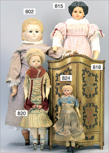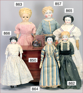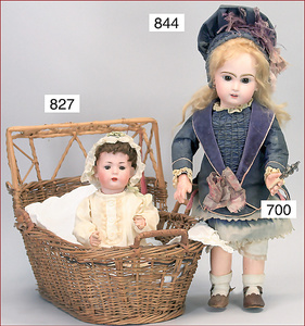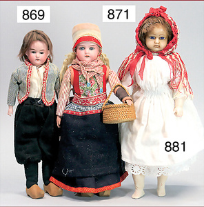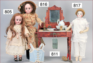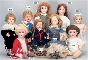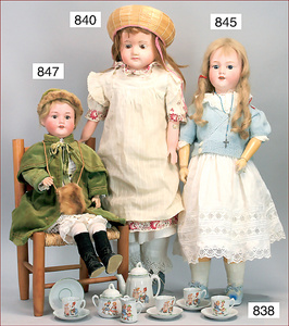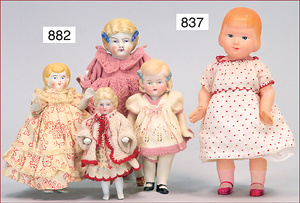 3 Porzellanpuppen, 1 x Puppenstuben-Puppe, bewegl. Arme und Beine, Kurbelkopf, blond modellierte Frisur, anmodellierte Schuhe und Strümpfe, 10 cm, 1 x Porzellan-Vollkopfjunge, Hersteller?, auf Masse-Sitzbabykörper, gemalte Augen, geschl. Mund, 15,5 cm, Halsausschnitt restauriert, 1 x Porzellan-Brustblattkopf-Puppe, Alter?, blond modellierte Frisur mit Haarband und modellierten Rosen, gemalte Augen, geschl. Mund, auf neuem Holz-Gliederkörper, 22 cm