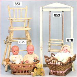 2 kl. Puppenwagen, neuer, 1 x 3-rädrig, Griff Höhe 23 cm, Länge 26 cm, Wachstuchverdeck bemalt, 1 x geprägte Pappe, bemalt, Wachstuchverdeck, Porzellan-Griffstange, Griff Höhe 30 cm, Länge 31 cm, dazu 2 Püppchen, 1 x Celluloid, 18 cm, 1 x Masse-Baby, farbig, 17 cm