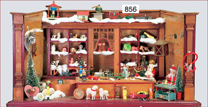 Kaufladen mit 12 Schubladen, Porzellan-Schildchen, Länge 50 cm, dazu 1 Blech-Herd, ohne Töpfe, 1 Bein lose, Länge 20 cm