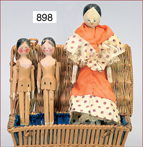 alter Puppenkorb gefüllt mit Puppenkleidung, Weißwäsche, teilw. auch Handarbeit, 1 Puppenschirm