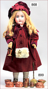 Masse-Brustblattkopf-Puppe, wachsüberzogen, schwarze fest eingesetzte Glasaugen, starke Krakeleebildung, Mohairperücke, Stoffkörper, Masse-Arme u. -Unterschenkel, mit anmodellierten Schuhen u. Strümpfen, 42 cm