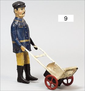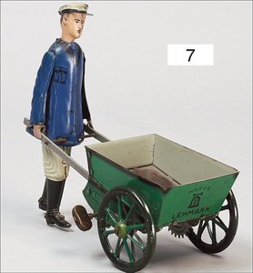 LEHMANN 860, Dienstmann mit Schubkarre, Blech lithogr., 14 cm, Spiralfederwerk intakt, sehr guter Zust.