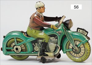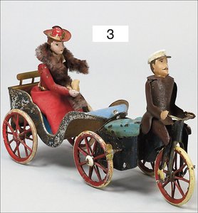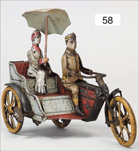Motorrad mit Seitenwagen, G und K 507/8, ca. 1910, Blech lithogr., Arm und Schirm der Frau ergänzt, bespielt, altersbed. Lackfehler, Spiralfederwerk intakt