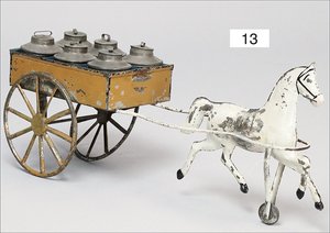 Pferdewagen mit Milchkannen, Blech handlackiert, deutsch, ca. 1910, 26 cm, bespielt, altersbed. Lackfehler, sonst gut