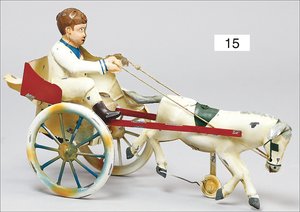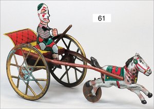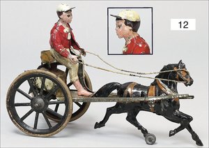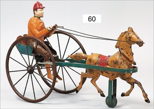 Trabrennfahrer, Blech handlackiert, ca. 1910, 32 cm, Uhrwerk intakt, geht etwas schwer, außergew. Größe, altersbed. Lackfehler, guter Zustand