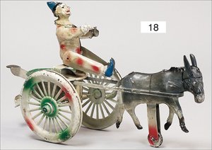 Clownwagen mit Esel, deutsch, Vorkrieg, Blech handlackiert, 25 cm, Schwungradantrieb intakt, teilw. farbl. ein wenig ausgebessert
