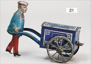 wohl GÜNTHERMANN Dienstmann mit Karre, 20 cm, Blech handlackiert, zw. Händen u. Karre nachgelötet, teilw. farbl. etwas ausgebessert, Uhrwerk intakt