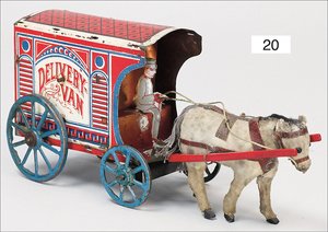 DELIVERY VAN, Blech lithogr., Spiralfederwerk intakt, Fahrerfigur, Zugesel, Holz/Papiermaché, leicht bespielt, Dachreling fehlt, 21,5 cm