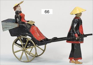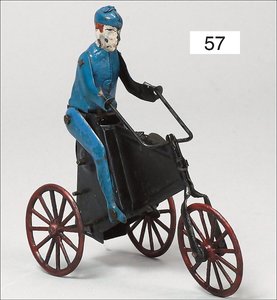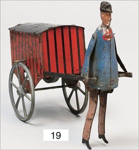 F. MARTIN Frankreich, Dienstmann mit Wagen, Blech lithogr., 16 cm, Schwungradantrieb, bespielt, altersbed. Lackfehler