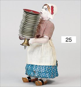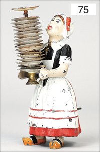 MARTAIN Frankreich, Magd mit Tellerstapel, Blech handlackiert, 17,5 cm, Uhrwerk geht etwas schwer, kleinere altersbed. Lackfehler, Teller lose