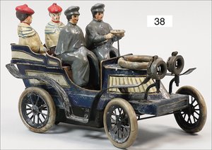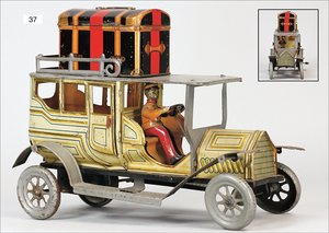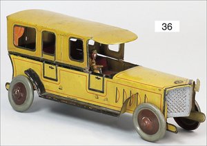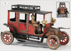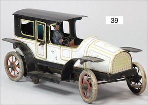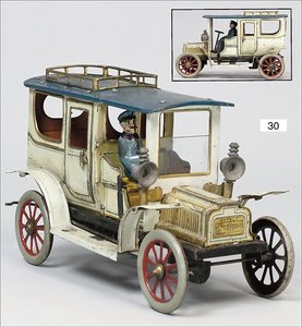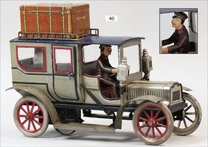 Landaulette, Blech lithogr., deutsch, ca. 1915, 27 cm, mit Fahrerfigur, 2 Türen zum Öffnen, Uhrwerk intakt, leicht bespielt, schöner Orig.-Zust.