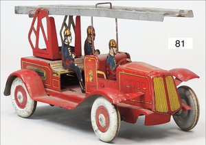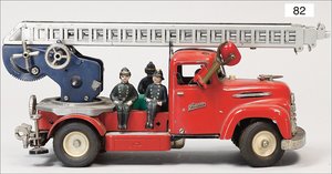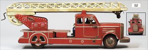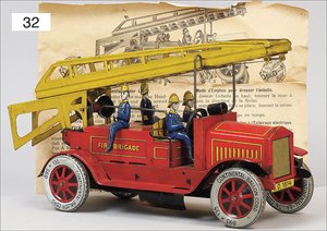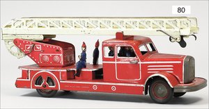 DISTLER Feuerwehr, Blech lithogr., 23 cm, 2 Scheinwerfer fehlen, Suchscheinwerfer elektr. beleuchtet, 4 Fahrerfiguren, guter Zust., mit Anleitung, 29 cm, Uhrwerk intakt, mit Orig.-Kart., Kart. stärker verschlissen