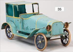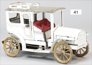 Landaulette, Blech handlackiert, ca. 1920, 30 cm, Uhrwerk intakt, gummibereift, bespielt, 1 Strebe am Dach gebrochen, an dieser Stelle etwas ausgebessert, Dach etwas verzogen, kl. Stellen farblich ausgebessert