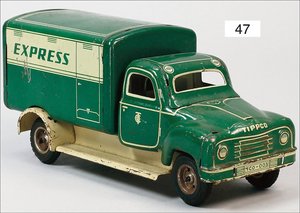 TIPP & CO Express, Lieferwagen, Blech lithogr., 20 cm, leicht bespielt, Friktionsantrieb defekt, altersbed. Lackfehler, Hecktür etwas verzogen
