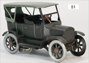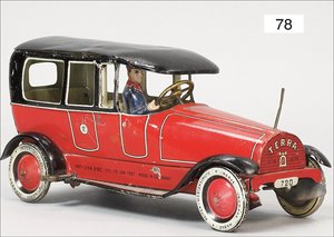 TIPP & CO Landaulette, ca. 1920, Spitzkühler, 25 cm, Blech lithogr., mit Fahrerfigur, Uhrwerk intakt, leicht bespielt, guter Zust., 1 Scheinwerfer fehlt