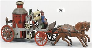 OROBR Feuerwehr, Blech lithogr., mit Fahrerfigur, 2 Pferde, Spiralfederwerk intakt, 29 cm, ausgefallen, Lithografie gut
