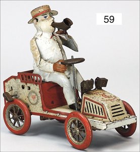 CARETTE Landaulette, Blech lithogr., Figur handlackiert, 33 cm, geschliffene Gläser, Uhrwerk defekt, Figur farbl. ausgebessert, Lampen ergänzt, sonst leicht bespielt, guter Zust.