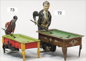 GÜNTHERMANN Billardspieler, Blech, handlackiert, Billardtisch, lithogr., 22 cm, altersbed. Lackfehler, Uhrwerk intakt, ca. 1920, bespielt, gut