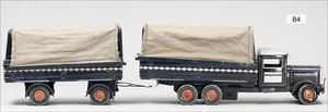 TIPP & CO LKW, 3- Achser, mit Anhänger und Plane, insgesamt 48 cm, ,,Genehmigter Fernverkehr", 50er Jahre, leicht bespielt, gut, Plane an einer Stelle eingerissen, Uhrwerk intakt
