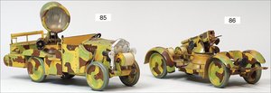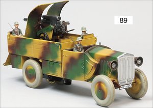 LINEOL Fliegerabwehrfahrzeug, Blech, Mimikry, lackiert, 6 Massefiguren sitzend, Uhrwerk intakt, Geschütz auf der Ladefläche höhenverstellbar, Lichtanlage intakt, 29 cm, sehr guter Zust.