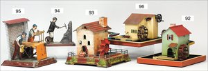 BING Wassermühle, ca. 1910, Blech handlackiert, Grundplatte 18x18 cm, bespielter Orig.-Zust., 1 Geländerteil liegt lose bei