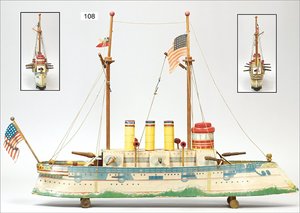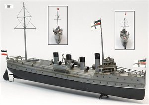 BING Kriegsschiff, Blech, handlackiert, 55 cm, Uhrwerk intakt, 3 Fahnen, 2 Rettungsboote, 1 kleine Abdeckung am Uhrwerk übermalt, Schiffsschraube fehlt, sonst sehr schöner Orig.-Zust.