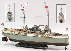 MÄRKLIN Schlachtschiff, MARYLAND, 68 cm, Blech handlackiert, 6 Geschütztürme, 1 Schornstein, 4 Rettungsboote, seitlich jeweils 4 einzelne Geschütze, 2 Kräne, 2 Masten, möglicherw. farbl. etwas ausgebessert, insgesamt guter Zustand