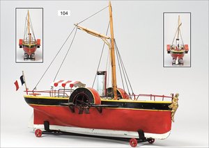 Raddampfer, Frankreich, Blech handlackiert, 1 Schornstein, 2 Bänke, überdacht, Mast, Holz, 56 cm, möglicherw. farbl. ausgebessert, um 1900, sehr dekorativ