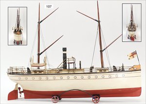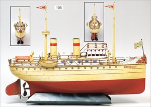 MÄRKLIN Dampfer, Kronstadt, 51 cm, Blech, handlackiert, 2 Masten, 2 Schornsteine, 2 Rettungsboote, Uhrwerkantrieb, teilw. farbl. etwas ausgebessert, insgesamt optisch in schönem Zust., ca. 1910
