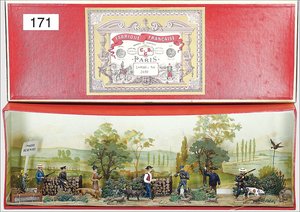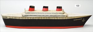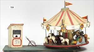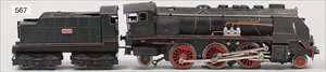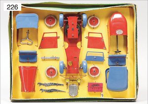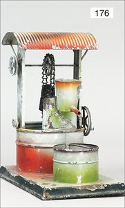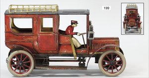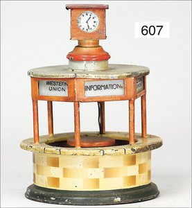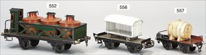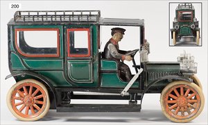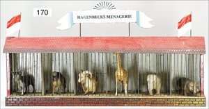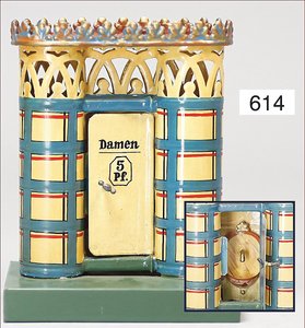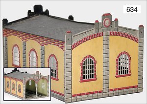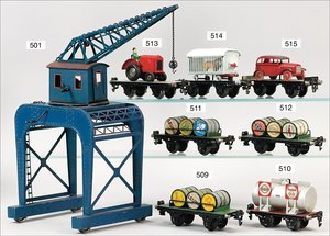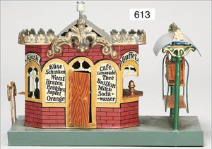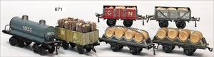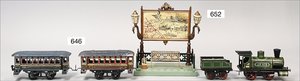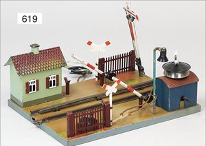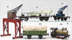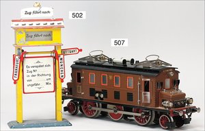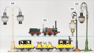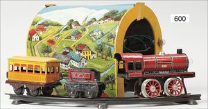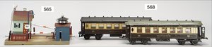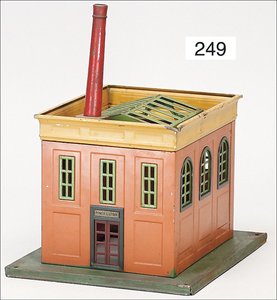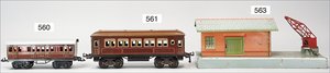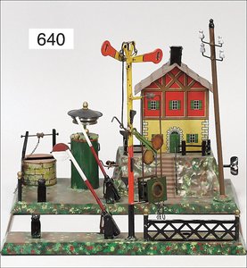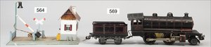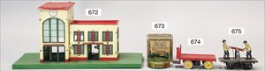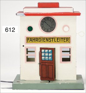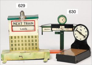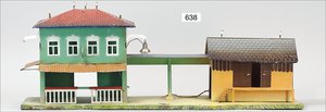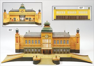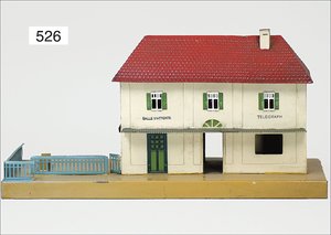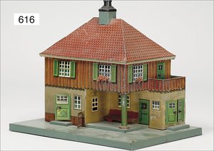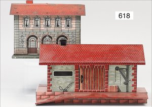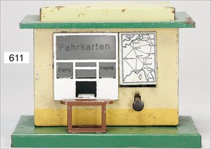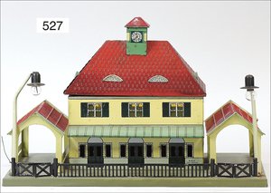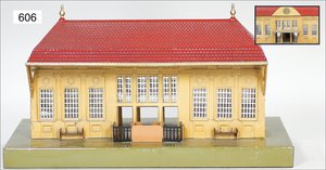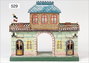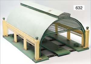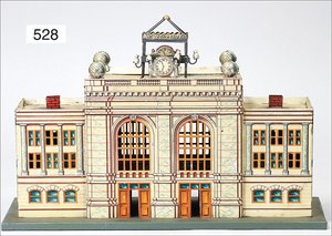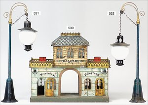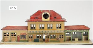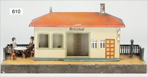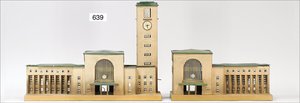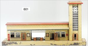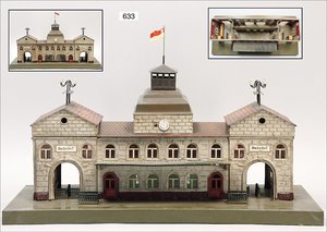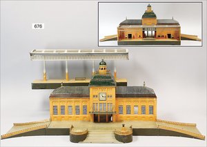MÄRKLIN Spur 0, Leipziger Bahnhof, Steinprägung, hohe Fenster mit Celluloidverglasung, Seiteneinstieg, 2 Auffahrrampen und breite Aufgangstreppe, kl. Vordach, Mittelbau mit Uhr, oben kl. Türmchen mit Rundgang, Dächer der Seitengebäude glatt, Bahnsteig-Schutzdach mit Unterführung, Wartesäle, Toiletten, Telegraphenbüro, Handgepäck, Waschbecken, Briefkasten, Mitteldurchgang mit Fahrkartenschaltern auf beiden Seiten, 92 cm x 43 cm x 36 cm, 1914-1925, 2 Eckmauern, 1 x Anschlusswand, sowie 3 Überdachungsstücke, Anschlusswand farblich etwas abweichend, absolut selten, schöner Orig.-Zust.