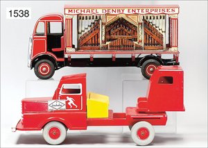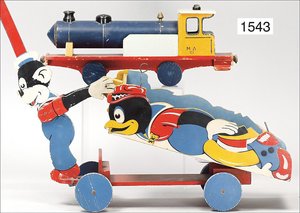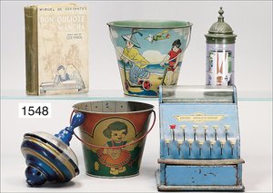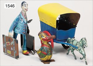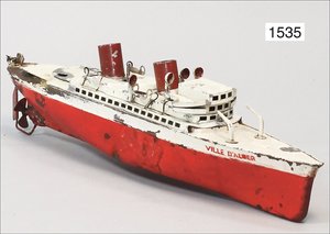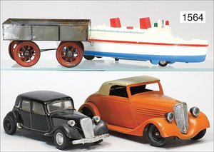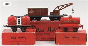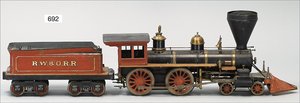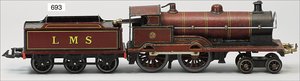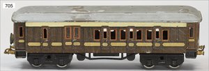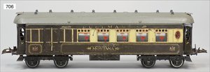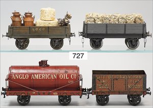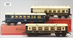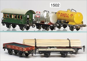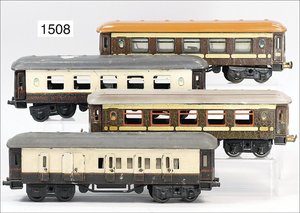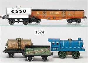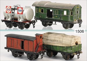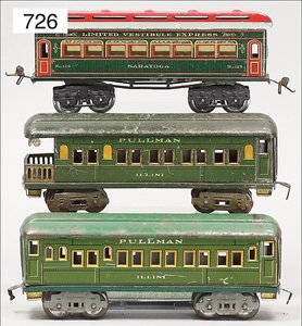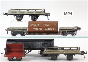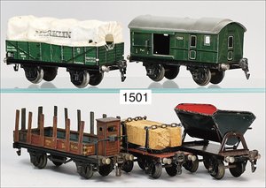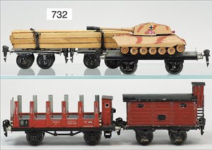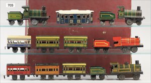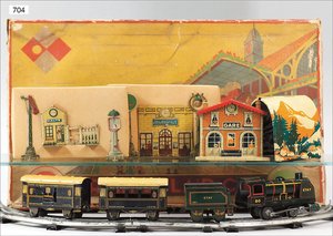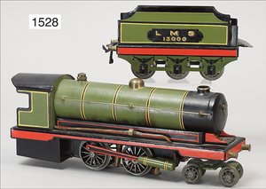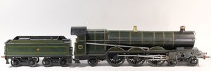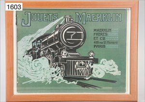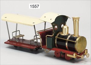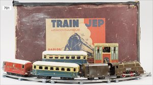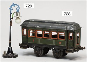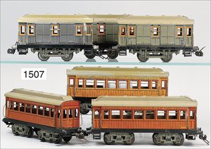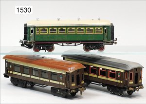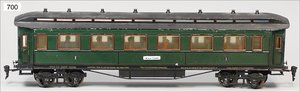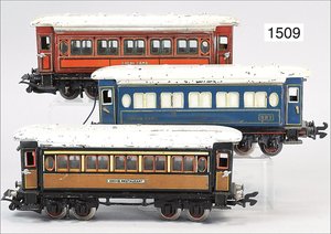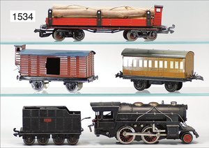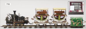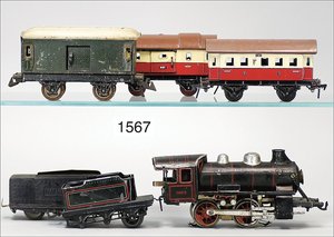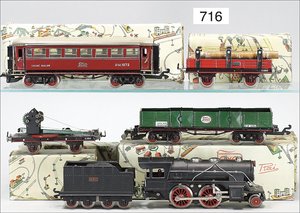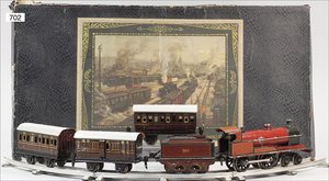 Zug, Verkauf über Märklin, Frankreich, beiliegendes Werbebild, Lokomotive abgebildet, im franz. Märklinkatalog, 1909, Märklin Fréres et Cie - Paris, hergestellt bei der Firma Bassett, England, LOCOMOTIVES A L´ÉCHELLE, Spurweite 67 mm, Spur 4, 2C1, 4-achsiger Tender, 4023 GWR, Modele Pacific, The great bear, Dampfantrieb, 1,35 m, grün/schwarz, mit goldenen Zierlinien, Brenner, technisch nicht geprüft, dazu 3 4-achsige Personenwagen, 95 cm, Holz lackiert, Federpuffer, Türen zum Öffnen, handlackiert, aufwendig gearbeitet, 1 Wagen Puffer fehlen, 1 Wagen Puffer verbogen, sehr schöner unberührter Orig.-Zust., nach Aussage des Einlieferers aus der thailändischen Königsfamilie, museal