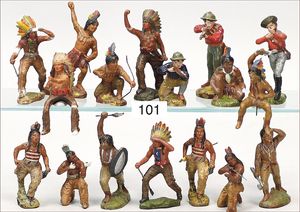 ELASTOLIN 10 cm Serie, Indianer und Trapper, 8 Teile, dazu 10 Teile ungemarkt, teils ausgebessert, Zust. 3-