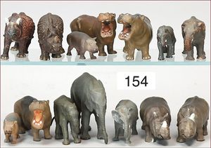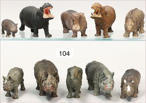 ELASTOLIN 6 Nashörner, Masse, 14 cm bis 17,5 cm, dazu 4 Nilpferde, meist Zust. 2