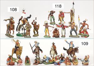 32 Teile Trapper und Indianer, kämpfend, lagerlebend und zu Pferd, Masse, 7,5 cm, dazu ein paar Figuren Kunststoff, Zust. 2-3