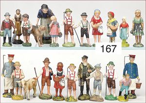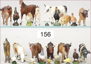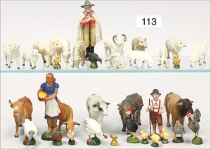 schönes gr. Konv. Bauernhoffiguren, ca. 80 Teile Federvieh, Kühe, Schafe, ELASOLIN u. a., Masse-Hirte 11 cm, meist Zust. 2