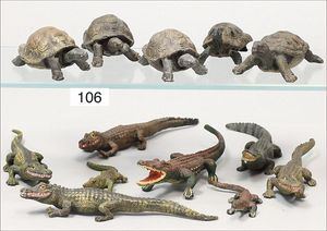 ELASTOLIN Masse, 8 Krokodile, 9 cm bis 20 cm, dazu 5 Schildkröten, meist Zust. 2