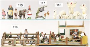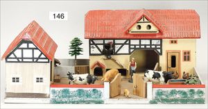 kl. Stall, Holz, ca. 40 Teile Federvieh, Masse, ELASTOLIN, u. a., dazu Magd und Knecht, 9,5 cm, Dach am Gebäude fehlt, meist Zust. 2