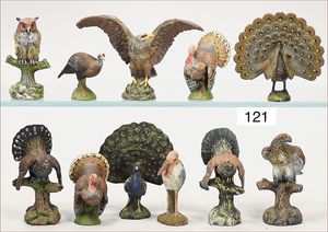 11 Teile Vögel, Adler, Eule, Pfau, Truthahn, u. a., teils ELASTOLIN oder LINEOL, teils ungemarkt, meist Zust. 2