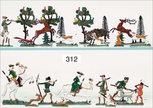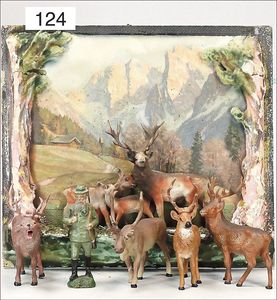 halbplastisches Bild, Bergszene, mit Hirschgruppe, dazu 4 Masse-Hirsche, 1 Jäger, ELASTOLIN, 11 cm, Zust. 2-3